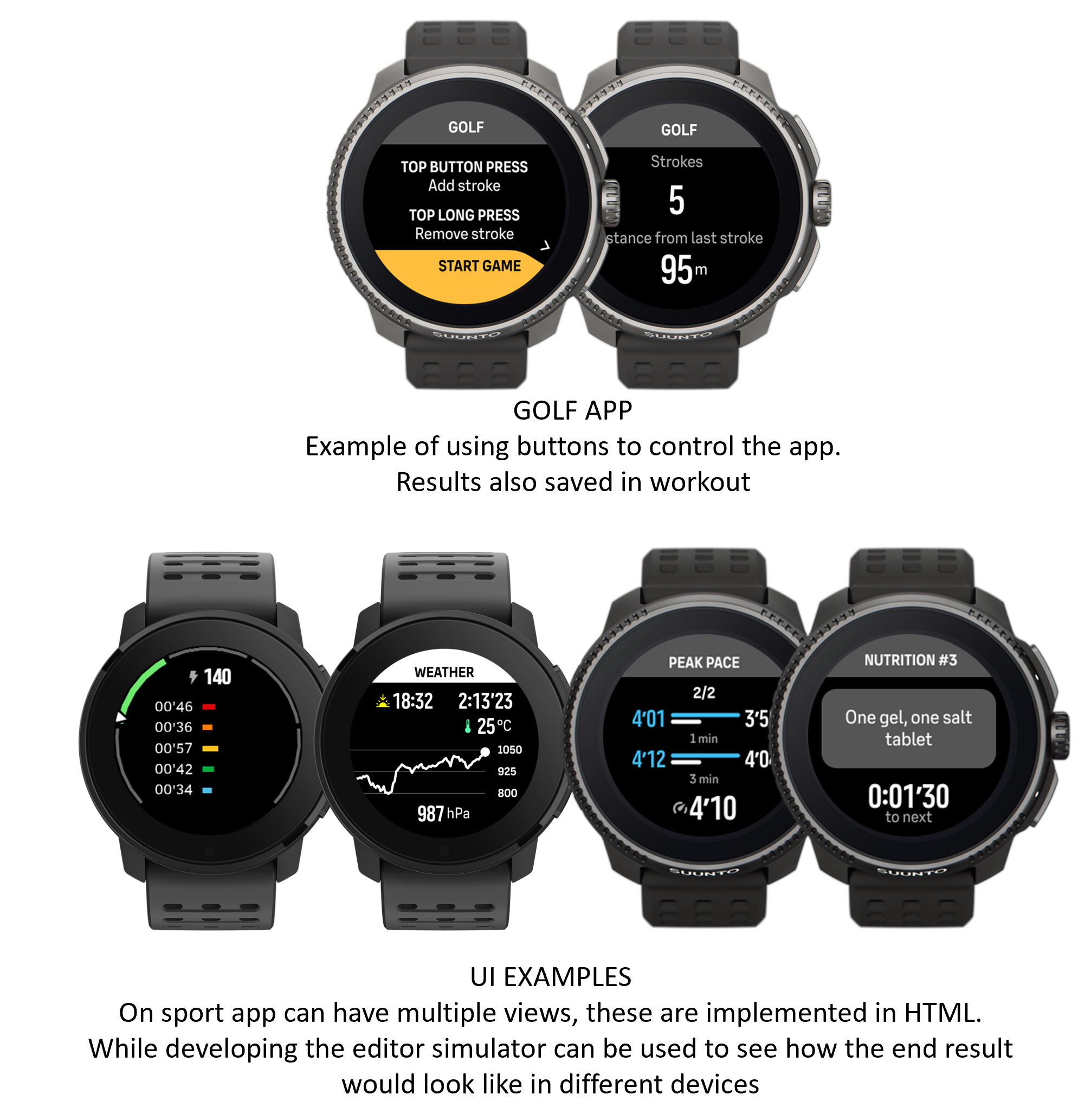 SuuntoPlus Sports Apps can use various real-time data sources, such as GPS, heart rate, altitude, or external Bluetooth Low Energy (BLE) devices. Apps access the data and display or react to it on the watch in real-time.