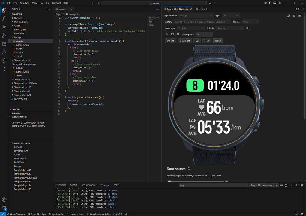 Test your SuuntoPlus sports app in VS Code using the SuuntoPlus simulator. It simulates watch measurement data (i.e. SuuntoPlus sports app input resources), such as GPS, heart rate and altitude data, and can be used to test your application's JavaScript code as well as user interface (HTML and image files).